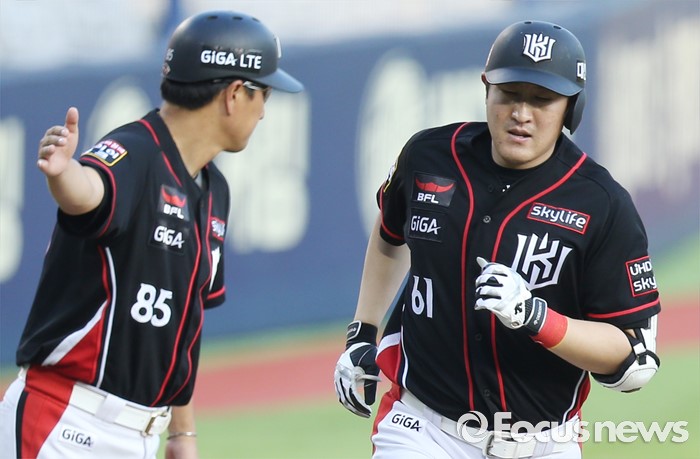 (서울=포커스뉴스) 5일 서울 잠실구장에서 열린 2016 프로야구 kt-LG 경기 3회초 2사 1루에서 kt 유한준이 좌월 2점 홈런을 치고 3루를 돌며 박계원 코치의 환영을 받고 있다.