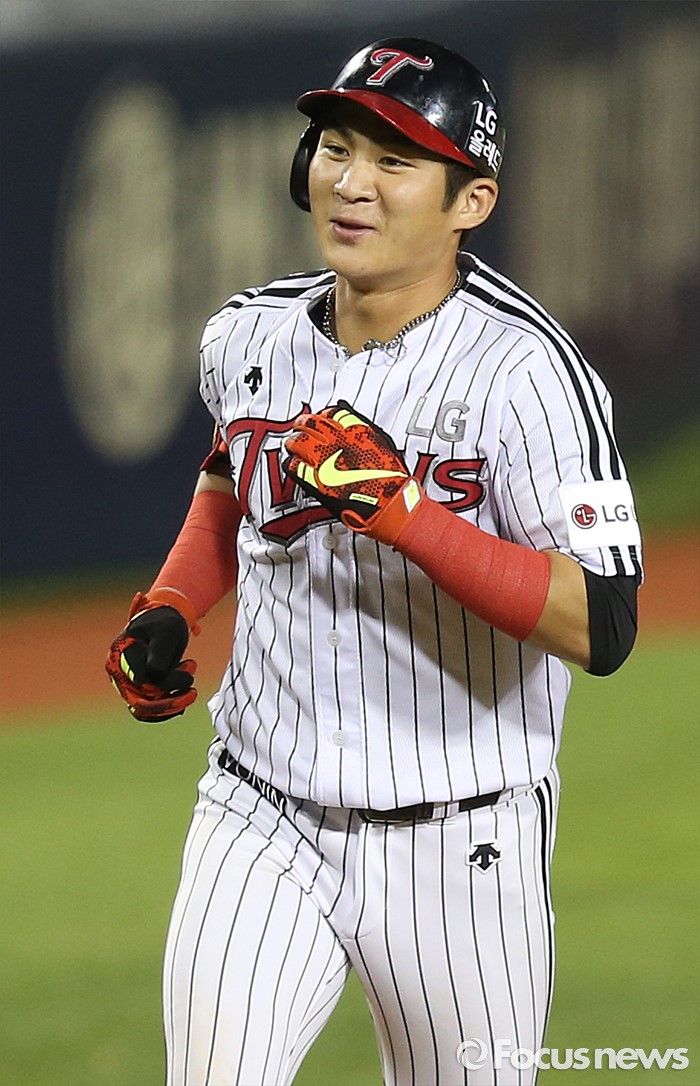 (서울=포커스뉴스) 5일 서울 잠실구장에서 열린 2016 프로야구 kt-LG 경기 7회말 2사후 LG 오지환이 우월 솔로 홈런을 치고 밝은 미소를 띠고 홈인하고 있다.