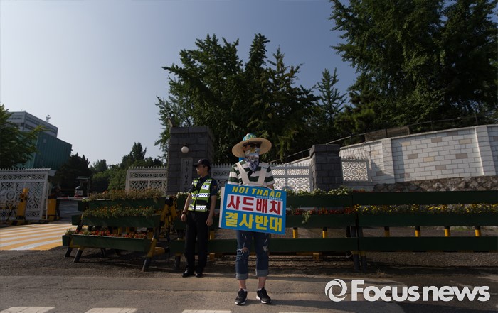 (서울=포커스뉴스) 8일 오전 서울 용산구 국방부 앞에서 사드배치철회 성주투쟁위원회 소속 성주군민이 사드 성주배치 철회를 촉구하는 1인 시위를 하고 있다.