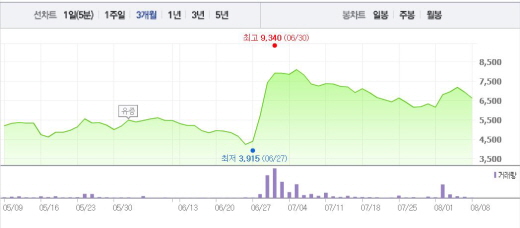 한편, 미국 플로리다주에서는 모기에 물려 지카바이러스에 감염된 환자가 14명으로 집계됐다. 이 중 여성은 2명, 남성은 10명이다. 미국 질병통제예방센터(CDC)는 여행 경보를 발령하고 임산부들의 출입 자제를 요청한 것으로 알려졌다.명문제약 주가흐름<사진출처=네이버 캡쳐>