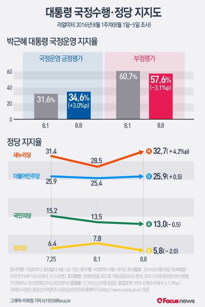 (서울=포커스뉴스) 8일 발표한 여론조사 기관 리얼미터 2016년 8월 1주차 주간집계에 따르면 박근혜 대통령의 국정수행 지지율이 30%대 중반으로 상승했다. 주요 정당 지지도는 새누리당의 지지율이 큰폭으로 상승한 반면 더불어민주당은 소폭 상승했고, 국민의당과 정의당은 내림세를 보였다.