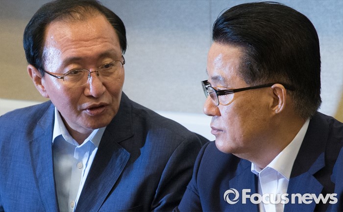 (서울=포커스뉴스) 8일 오전 서울 여의도 국회 귀빈식당에서 열린 조선 산업 발전과 조선 산업 노동자의 고용 안정을 위한 국회의원 모임 발족 기자회견에 참석한 박지원(오른쪽) 국민의당 비상대책위원장과 노회찬 정의당 원내대표가 대화하고 있다.
