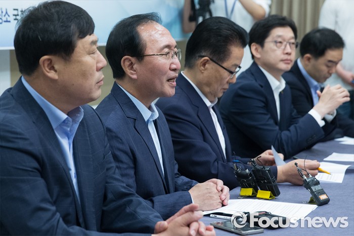(서울=포커스뉴스) 8일 오전 서울 여의도 국회 귀빈식당에서 열린 조선 산업 발전과 조선 산업 노동자의 고용 안정을 위한 국회의원 모임 발족 기자회견에 참석한 의원들이 발언하고 있다. 왼쪽부터 김종훈 무소속 의원, 노회찬 정의당 원내대표, 박지원 국민의당 비상대책위원장, 김경수 더불어민주당 의원, 채이배 국민의당 의원.