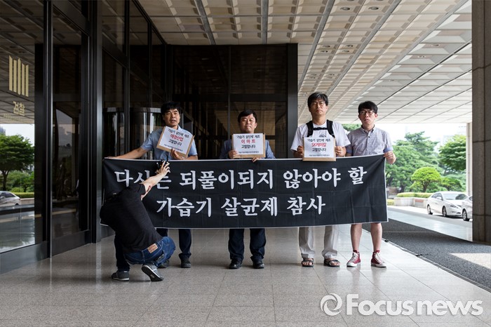 (서울=포커스뉴스) 8일 오전 서울 서초구 서울중앙지방검찰청 앞에서 가습기살균제참사전국네트워크 회원들이 SK케미칼, 애경산업, 이마트에 대한 수사를 촉구하며 3개사 전·현직 최고위 임원들에 대한 고발장을 제출하기 전 취지에 대해 설명하고 있다.