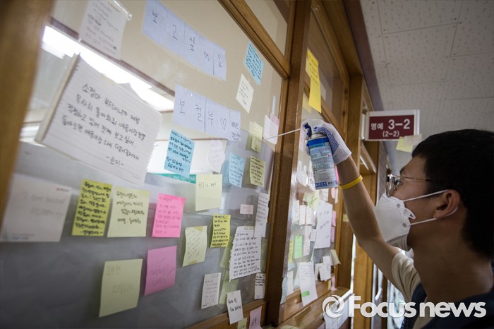 (안산=포커스뉴스) 세월호 참사에서 희생된 단원고등학교 학생들의 교실 이전 절차가 시작된 8일 오전 4.16 기억 저장소 관계자들과 자원봉사자들이 경기도 안산시 단원고등학교에서 교실 이전을 위한 준비 작업으로 '종이 유물 정리'를 하고 있다.