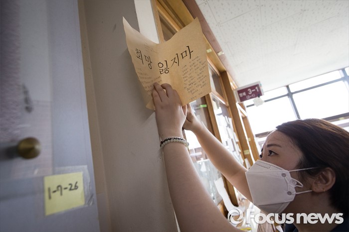 | △ 기억교실 이전, 편지와 메시지 정리하는 봉사자들 |