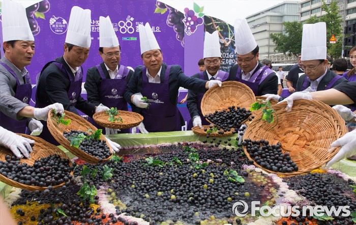 (서울=포커스뉴스) 8일 오전 서울 광화문광장에서 열린 '2016 포도데이' 행사에 참석한 이상욱(왼쪽 세번쨰) 농협중앙회 농업경제 대표이사를 비롯한 내빈들이 포도 냉소면을 만들고 있다.