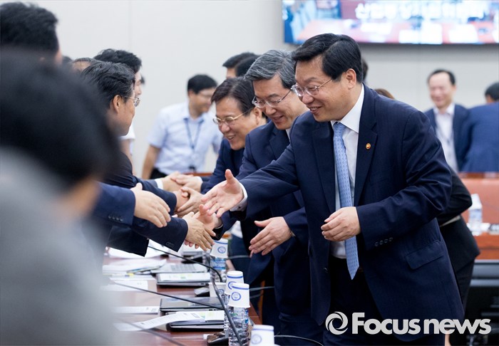 (서울=포커스뉴스) 8일 오후 서울 여의도 국회에서 산업통상자원위원회 전체회의를 마친 주형환 산업통상자원부 장관, 주영섭 중소기업청장 등이 의원들과 악수하고 있다.