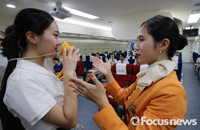 (대전=포커스뉴스) 8일 오후 대전 배재대학교에서 열린 제3회 예비승무원대회 예선에 참가한 고등학생들이 기내 안전 교육을 받고 있다.