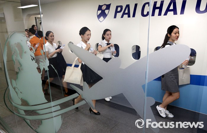 (대전=포커스뉴스) 8일 오후 대전 배재대학교에서 열린 제3회 예비승무원대회 예선에 참가한 고등학생들이 기내 안전·예절 교육을 받고 실습장을 나서고 있다.