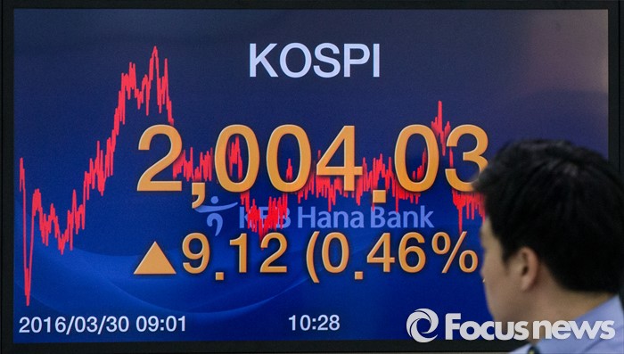 이날 개인은 2019억원 순매도했다. 외국인과 기관은 각각 893억원과 859억원 순매수했다. 외국인은 지난달 7일 이후 이달 3일 단 하루를 제외하곤 순매수 행진을 지속하고 있다.30일 서울 중구 KEB외환은행 본점 딜링룸 전광판에 코스피 지수가 전일보다 9.12p (0.46%) 상승한 2004.03을 나타내고 있다. 이날 코스피지수는 재닛 옐런 미국 중앙은행(Fed) 의장의 비둘기파 발언에 힘입어 시가 기준 2000선을 돌파했다. 코스피가 시가 기준으로 2000선을 돌파한 것은 지난해 12월24일(2009.34) 이후 처음이다. 2016.03.30 양지웅 기자