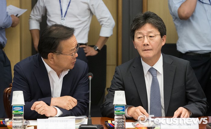 (서울=포커스뉴스) 8일 오후 서울 여의도 국회 의원회관에서 열린 광주시-대구시 예산·정책 간담회에 참석한 유승민(오른쪽) 새누리당 의원과 김부겸 더불어민주당 의원이 대화하고 있다.
