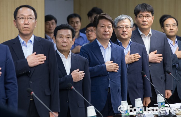 (서울=포커스뉴스) 8일 오후 서울 여의도 국회 의원회관에서 열린 광주시-대구시 예산·정책 간담회에 참석한 윤장현(왼쪽 두번째) 광주시장과 권영진(왼쪽 세번째) 대구시장 등 참석자들이 국기에 대한 경례를 하고 있다.
