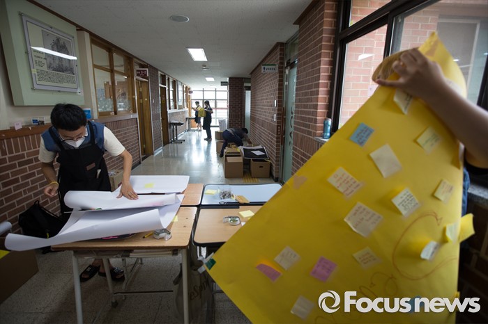 (안산=포커스뉴스) 세월호 참사에서 희생된 단원고등학교 학생들의 교실 이전 절차가 시작된 8일 오후 4.16 기억 저장소 관계자들과 자원봉사자들이 경기도 안산시 단원고등학교에서 교실 이전을 위한 준비 작업으로 '종이 유물 정리'를 하고 있다.