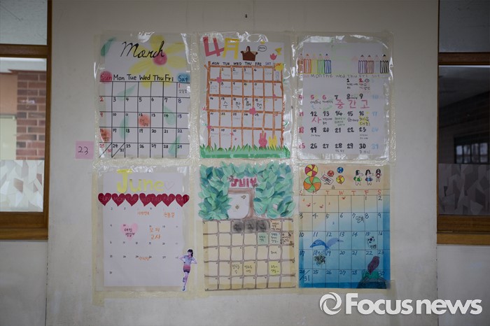 (안산=포커스뉴스) 세월호 참사에서 희생된 단원고등학교 학생들의 교실 이전 절차가 시작된 8일 오후 경기도 안산시 단원고등학교 기억교실에 2년 전 희생자 아이들이 만들어 붙인 4월 달력이 보이고 있다.
