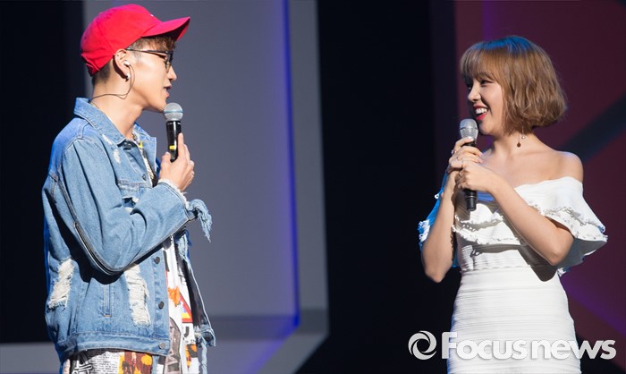 (서울=포커스뉴스) 8일 오후 서울 광진구 예스24 라이브홀에서 첫 솔로 미니앨범을 발표한 가수 준케이가 백아연과 무대를 마친후 인사를 나누고 있다.