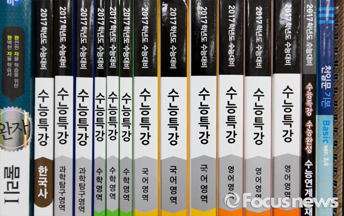 (안성=포커스뉴스) 2017학년도 대학수학능력시험을 101일 앞둔 8일 오후 경기도 안성종로기숙학원에서 재수생들의 수능서적이 책장에 꽂혀있다.