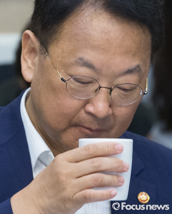 (서울=포커스뉴스) 9일 오전 서울 여의도 국회 귀빈식당에서 열린 2017년도 예산 당정협의에 참석한 유일호 경제부총리 겸 기획재정부 장관이 물을 마시고 있다.