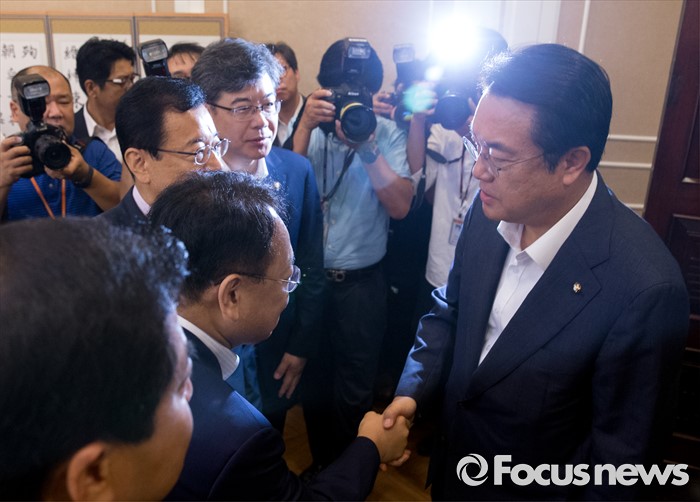 (서울=포커스뉴스) 9일 오전 서울 여의도 국회 귀빈식당에서 열린 2017년도 예산 당정협의에 참석한 정진석(오른쪽) 새누리당 원내대표와 유일호 경제부총리 겸 기획재정부 장관이 인사하고 있다.