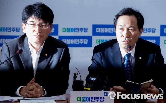 (서울=포커스뉴스) 9일 오전 서울 여의도 국회에서 열린 더불어민주당 원내대책회의에 참석한 우상호 원내대표가 모두발언을 하고 있다. 왼쪽은 박완주 원내수석부대표.