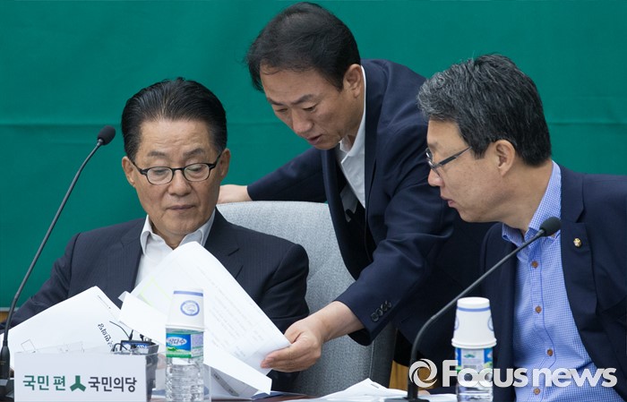 (서울=포커스뉴스) 9일 오전 서울 여의도 국회에서 열린 국민의당 의원총회에 참석한 박지원(왼쪽부터) 비상대책위원장, 김명진 비서실장, 김성식 정책위의장이 대화하고 있다.