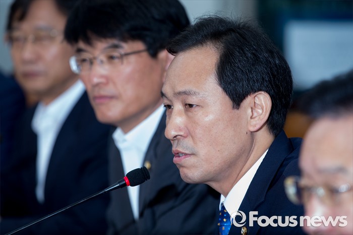 (서울=포커스뉴스) 9일 오전 서울 여의도 국회에서 열린 더불어민주당 원내대책회의에 참석한 우상호 원내대표가 모두발언을 하고 있다.
