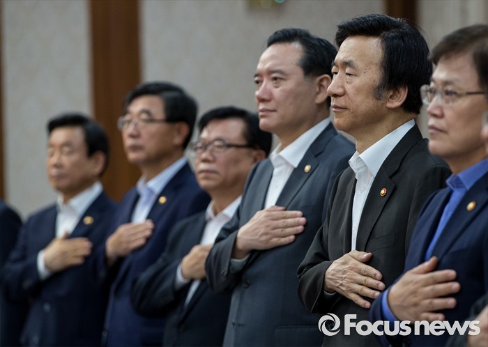 (서울=포커스뉴스) 9일 오전 정부서울청사에서 열린 국무회의에 참석한국무위원들이 국민의례를 하고 있다.