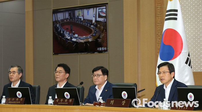 (세종=포커스뉴스) 황교안(오른쪽) 국무총리가 9일 오전 세종시 정부세종청사 국무회의장에서 서울-세종 영상회의로 열린 국무회의를 주재하고 있다.