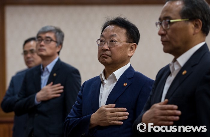 (서울=포커스뉴스) 9일 오전 정부서울청사에서 열린 국무회의에 참석한 유일호 경제부총리 겸 기획재정부 장관 및 국무위원들이 국민의례를 하고 있다.