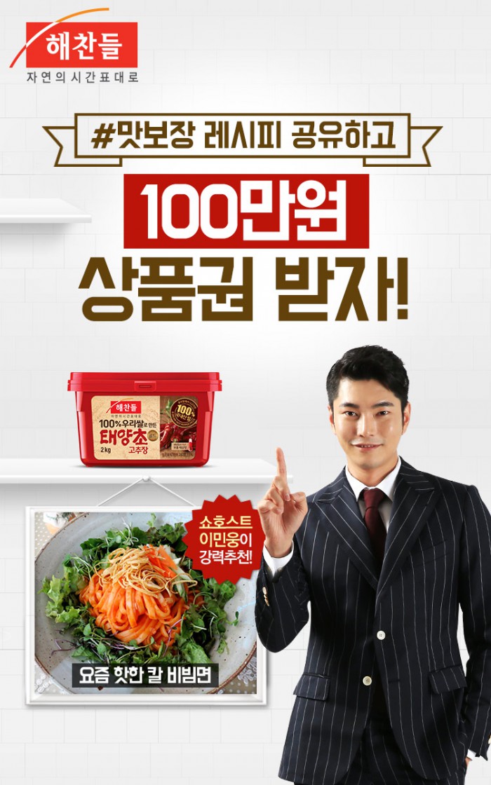 9일 CJ제일제당에 따르면 CJ제일제당은 오는 31일까지 홈페이지를 통해 레시피 관련 이벤트를 진행한다. '맛보장 10분 레시피 공유 이벤트'에서는 칼비빔면, 스팸고추장찌개, 맛보장떡꼬치, 매콤고추장닭강정 등 해찬들 고추장 간단 레시피 중 마음에 드는 메뉴를 SNS에 공유하고 추천하면 된다. 추첨을 통해 백화점 상품권과 제품 키트, 영화예매권 등을 증정한다.
