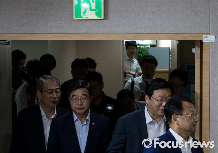 (서울=포커스뉴스) 9일 오전 정부서울청사에서 열린 '2016년 추경예산안 국회 조기통과' 관련 합동브리핑에 참석한 유일호(맨 오른쪽) 경제부총리 겸 기획재정부 장관 및 관계부처 장차관들이 회견장에 들어오고 있다.