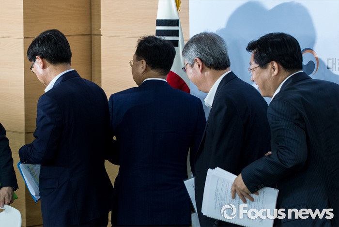 (서울=포커스뉴스) 9일 오전 정부서울청사에서 열린 '2016년 추경예산안 국회 조기통과' 관련 합동브리핑에 참석한 유일호(왼쪽 두번째) 경제부총리 겸 기획재정부 장관 및 관계부처 장차관들이 질의응답을 마친후 회견장을 나서고 있다.