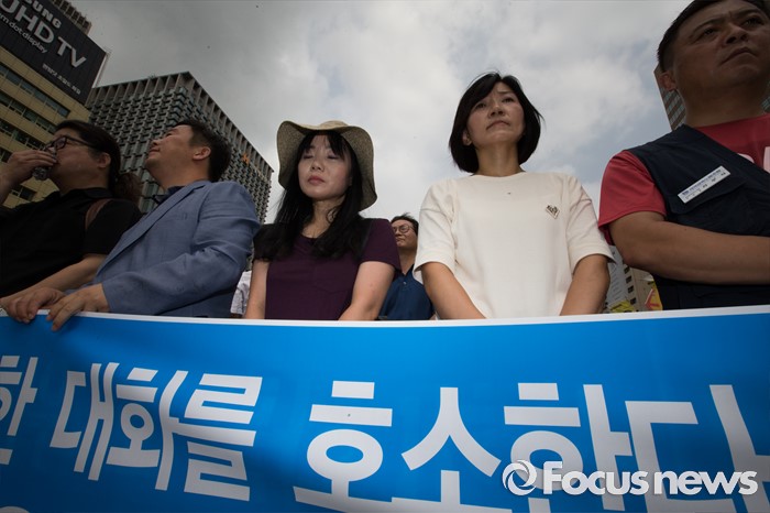 (서울=포커스뉴스) 9일 오전 서울 종로구 광화문광장에서 열린 시민사회단체연대회의 '갑을오토텍 사태의 평화적 해결과 상생을 위한 대화 호소 기자회견'에 참석한 갑을오토텍지회 조합원 가족이 호소문 낭독 후 생각에 잠겨 있다.