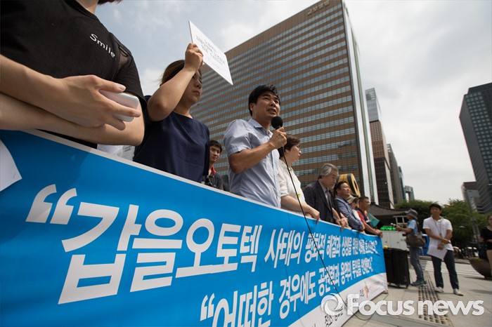 (서울=포커스뉴스) 9일 오전 서울 종로구 광화문광장에서 열린 '갑을오토텍 사태의 평화적 해결과 상생을 위한 대화 호소 기자회견'에서 시민사회단체연대회의 회원이 발언하고 있다.