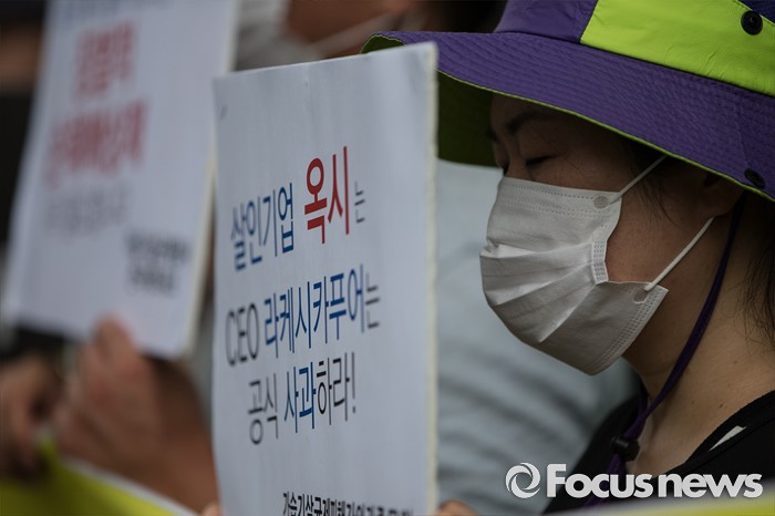 (서울=포커스뉴스) 9일 오후 서울 영등포구 옥시 한국 본사 앞에서 가습기 살균제 피해자와 유가족들이 옥시 최종배상안 철회와 상세한 수사를 촉구하며 기자회견을 하고 있다.