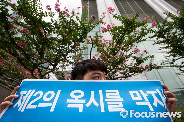 (서울=포커스뉴스) 9일 오후 서울 영등포구 옥시 한국 본사 앞에서 가습기 살균제 피해자와 유가족들이 옥시 최종배상안 철회와 상세한 수사를 촉구하며 기자회견을 하고 있다.