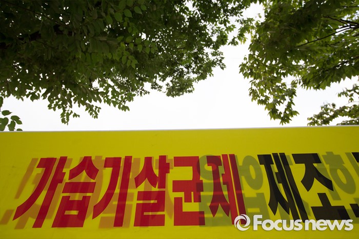(서울=포커스뉴스) 9일 오후 서울 영등포구 옥시 한국 본사 앞에서 열린 '옥시 최종배상안 발표 규탄 집회'에 옥시의 가습기 살균제 제조 및 판매를 규탄하는 현수막이 걸려있다.