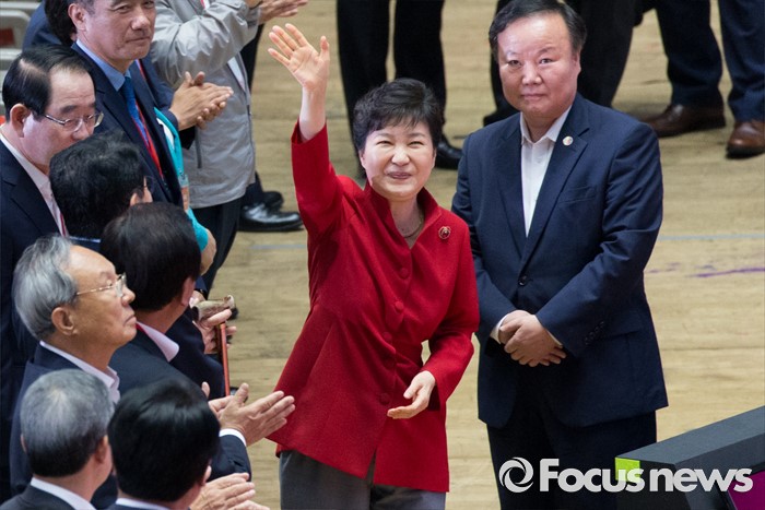 (서울=포커스뉴스) 박근혜 대통령이 9일 오후 서울 송파구 잠실실내체육관에서 제4차 새누리당 전당대회에 입장하며 인사를 하고 있다.