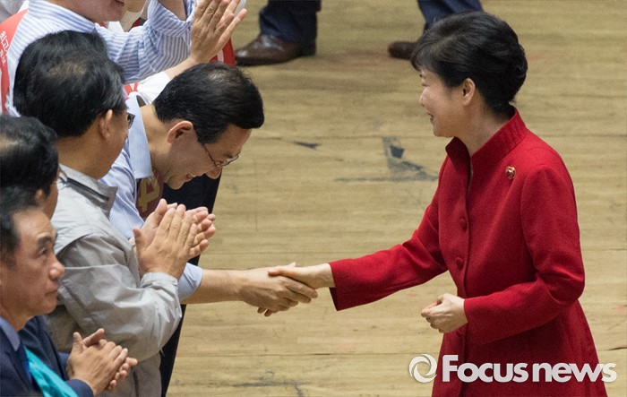 (서울=포커스뉴스) 박근혜 대통령이 9일 오후 서울 송파구 잠실실내체육관에서 제4차 새누리당 전당대회에 입장하며 주호영 당대표 후보와 인사를 하고 있다.