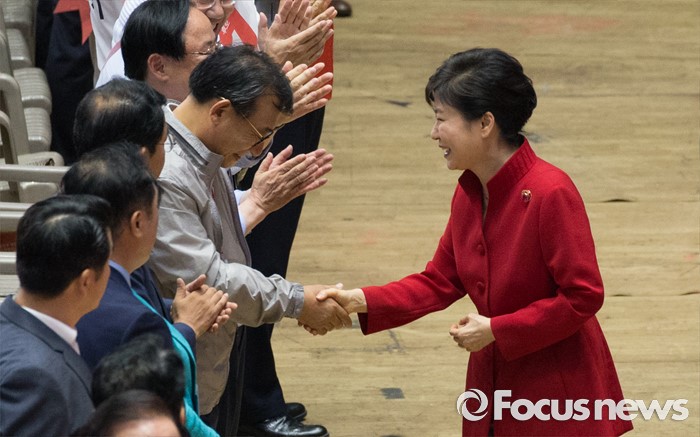 박 대통령은 "새 출발을 다짐하는 전당대회에서 당원 동지 여러분을 만나게 돼 반갑다. 그동안 각 지역에서 성원해준 여러분 덕분에 원만하게 국정을 운영할 수 있었다"고 인사를 건넸다.