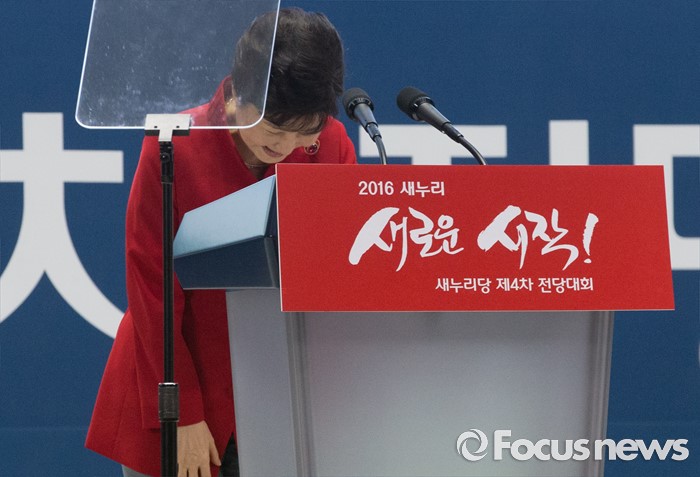 (서울=포커스뉴스) 박근혜 대통령이 9일 오후 서울 송파구 잠실실내체육관에서 열린 새누리당 4차 전당대회에 참석해 축사에 앞서 인사하고 있다.