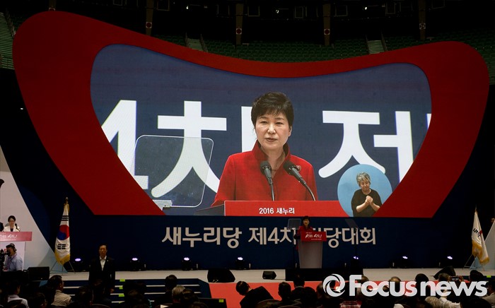 (서울=포커스뉴스) 박근혜 대통령이 9일 오후 서울 송파구 잠실실내체육관에서 열린 새누리당 4차 전당대회에 참석해 축사를 하고 있다.