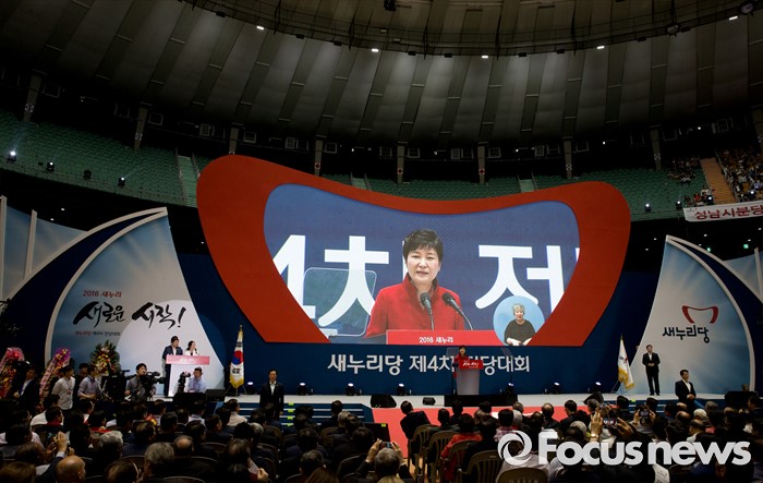 (서울=포커스뉴스) 박근혜 대통령이 9일 오후 서울 송파구 잠실실내체육관에서 열린 새누리당 4차 전당대회에 참석해 축사를 하고 있다.