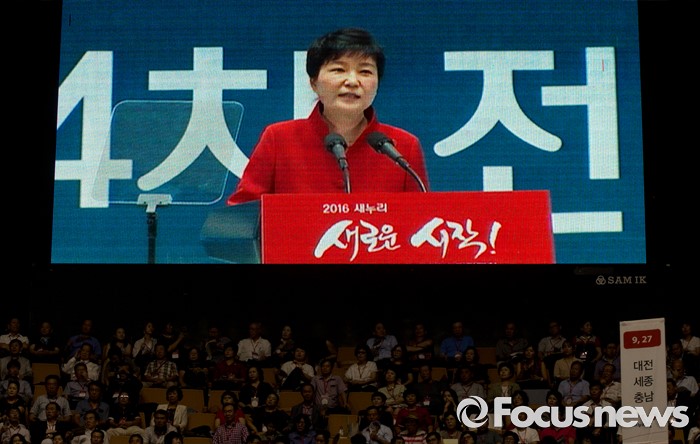 (서울=포커스뉴스) 박근혜 대통령이 9일 오후 서울 송파구 잠실실내체육관에서 열린 새누리당 4차 전당대회에 참석해 축사를 하고 있다.