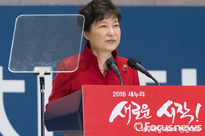(서울=포커스뉴스) 박근혜 대통령이 9일 오후 서울 송파구 잠실실내체육관에서 열린 새누리당 4차 전당대회에 참석해 축사를 하고 있다.