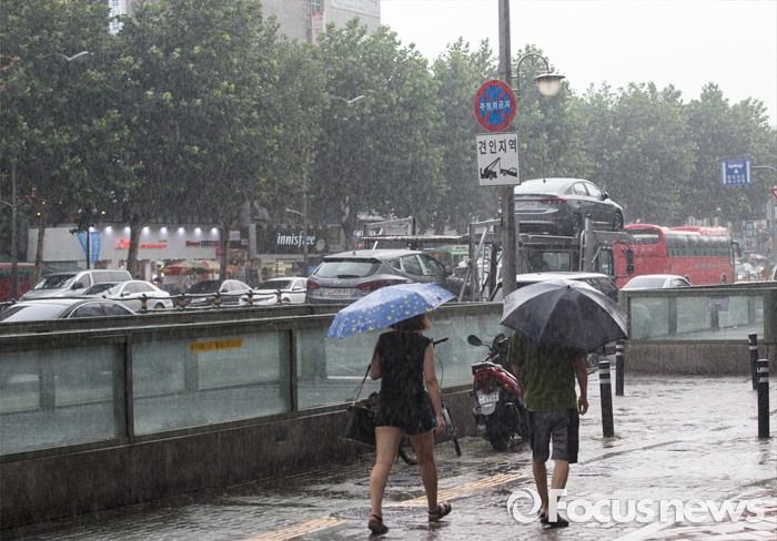(서울=포커스뉴스) 9일 오후 서울 동작구 이수역 인근에 시민들이 비를 피해 발걸음을 재촉하고 있다.