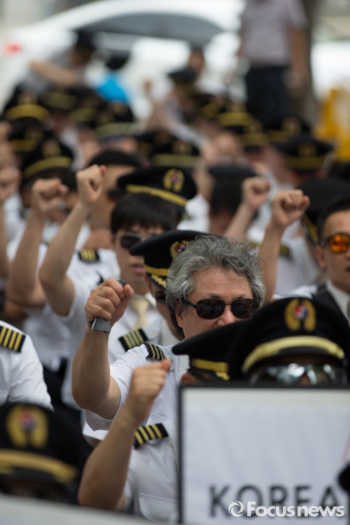 (서울=포커스뉴스) 9일 오후 서울 종로구 서울지방국세청 앞에서 열린 대한항공 경영정상화를 위한 세무조사 촉구대회에서 대한항공 조종사 노동조합 조합원들이 구호를 외치고 있다.