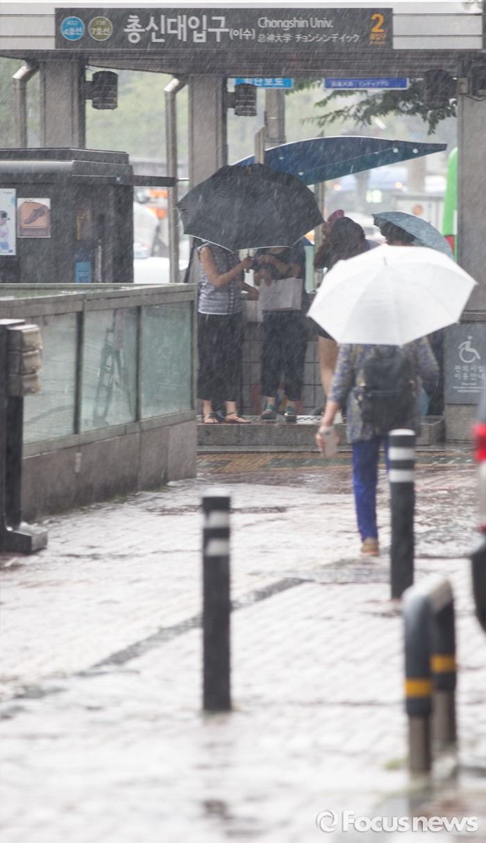 (서울=포커스뉴스) 9일 오후 서울 동작구 이수역 인근에 시민들이 비를 피해 발걸음을 재촉하고 있다.