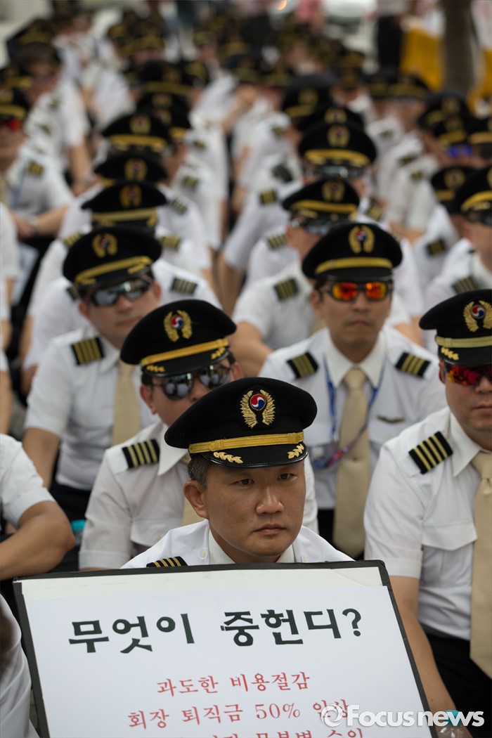 (서울=포커스뉴스) 9일 오후 서울 종로구 서울지방국세청 앞에서 열린 대한항공 경영정상화를 위한 세무조사 촉구대회에서 대한항공 조종사 노동조합 조합원들이 연대사를 듣고 있다.