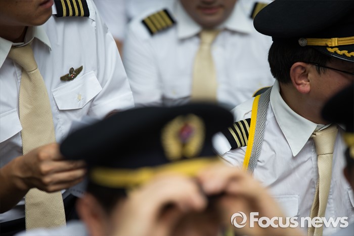 (서울=포커스뉴스) 9일 오후 서울 종로구 서울지방국세청 앞에서 대한항공 조종사 노동조합 조합원들이 대한항공 경영정상화를 위한 세무조사 촉구대회 준비를 위해 자리에 앉아 있다.